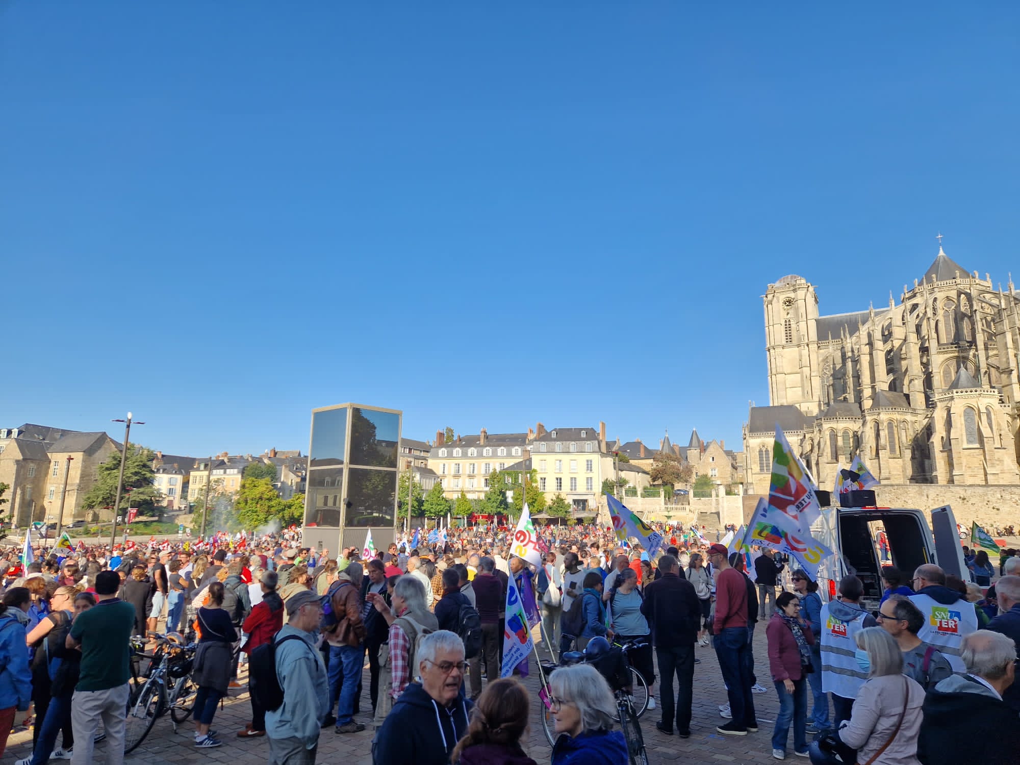 Les cinq cortèges sarthois ont rassemblé plus de 8000 personnes le 18 septembre. Une mobilisation de très haut niveau comme en témoigne cette vue de la place des Jacobins au Mans avant le départ de la manifestation. Le cortège s'est étiré sur plus d'un kilomètre (source : Le Maine libre).