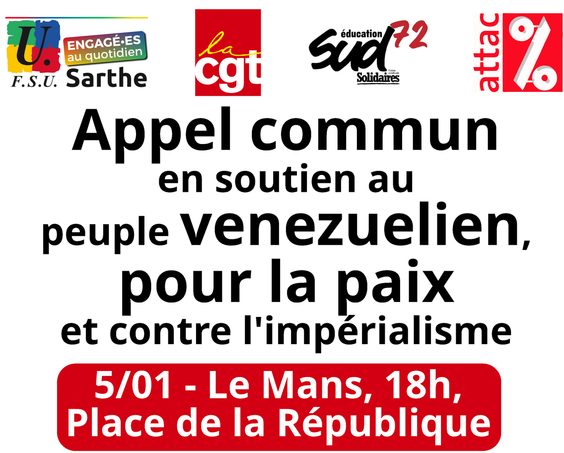 Dans le cadre des indispensables mobilisations qui s’organisent pour dénoncer l’agression impérialiste des États-Unis d’Amérique contre le Vénézuéla, la FSU 72 a lancé un appel commun à ce jour validé par la CGT 72, SUD Éducation 72 et ATTAC. D’autres organisations consultent dans la perspective de rejoindre cet appel COMMUN.